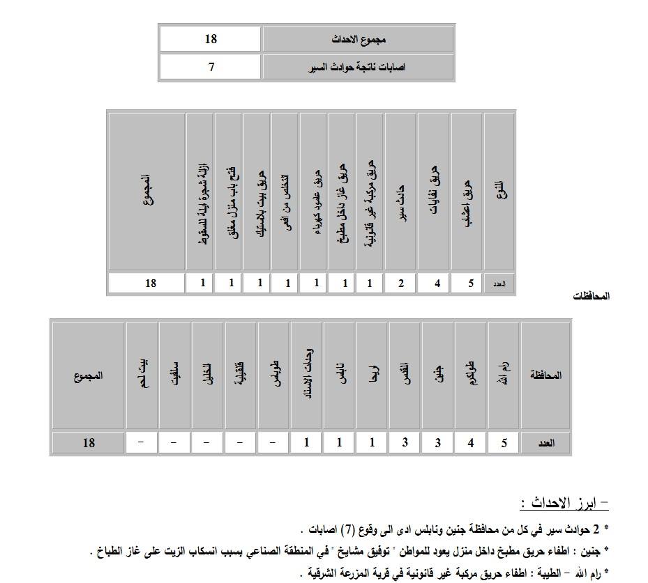ملخص نشاط طواقم الدفاع المدني الفلسطيني ابتداءً من يوم الاثنين 18.12.2017، حتى صباح يوم الثلاثاء 19.12.2017.