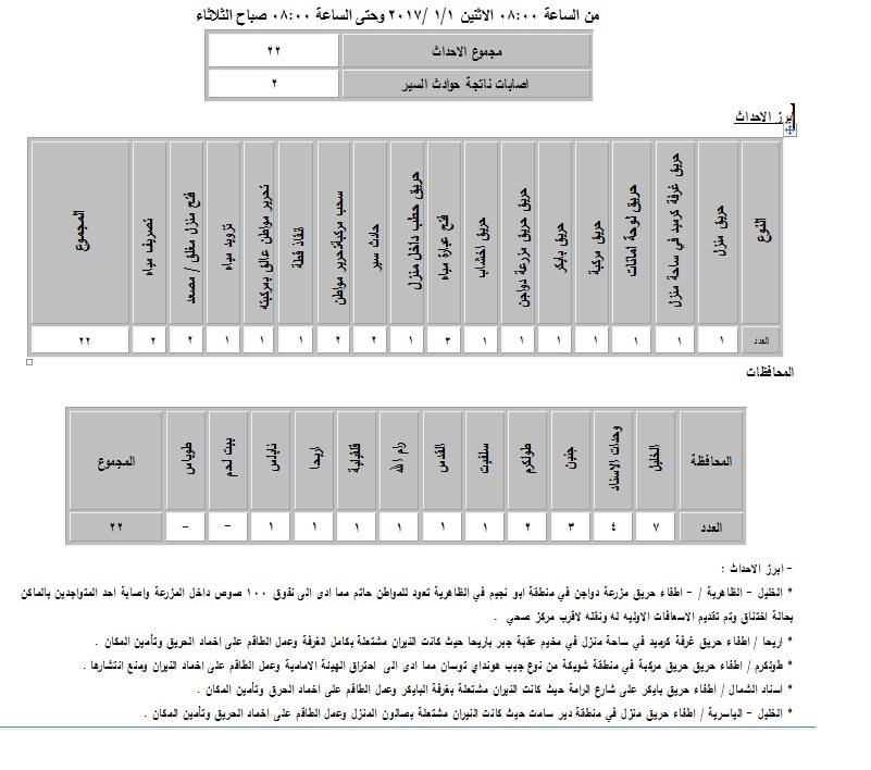 ملخص نشاط طواقم الدفاع المدني الفلسطيني ابتداءً من يوم الاثنين 1.01.2018، وحتى يوم الثلاثاء 2.01.2018.