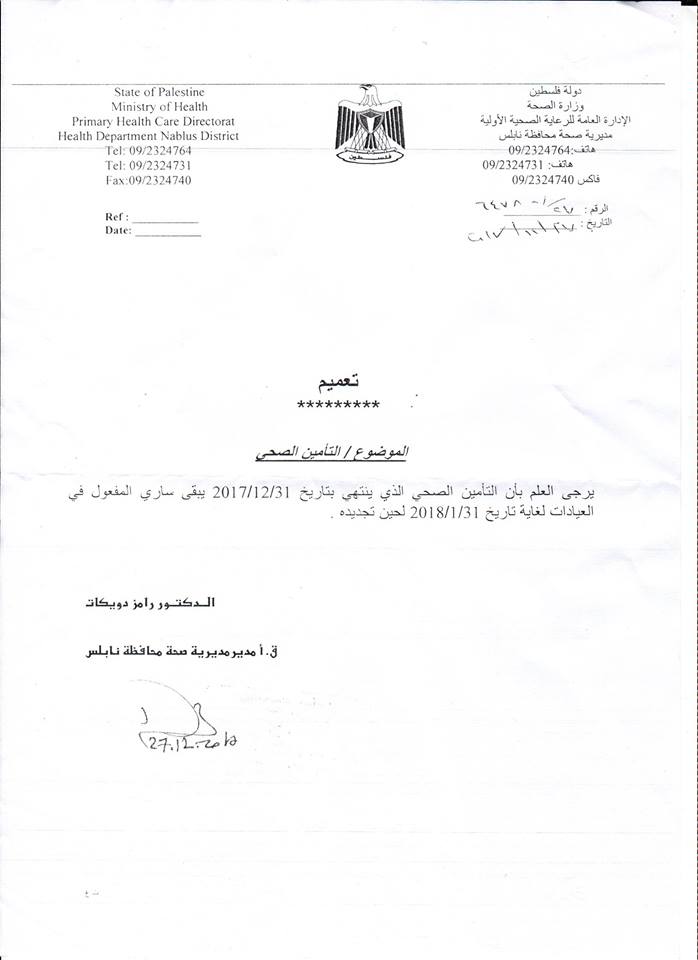 مديرية صحة محافظة نابلس تعلن عن استمرار مفعول التأمين الصحي لغاية تاريخ 31.01.2018، لحين تجديده.