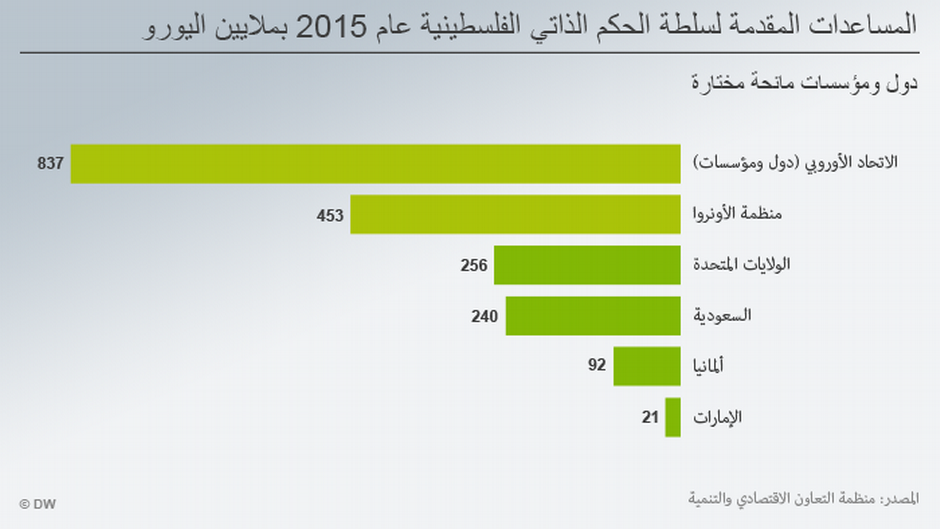 قدّمت مؤسسات الاتحاد الأوروبي، حسب أرقام ODA، في عام 2015، ما يقارب 408 ملايين دولار للسلطة الفلسطينية، ممّا يجعل مؤسسات هذا الاتحاد ثانية على صعيد المساعدات الإنسانية بعد الأونروا، علماً أن احتساب ما تقدمه مؤسسات الاتحاد، زيادة على الدول الأعضاء، للأراضي الفلسطينية، حسب المؤشر ذاته وفي العام ذاته، وصل إلى 837 مليون يورو (حوالي مليار دولار)، أي أن هذا الرقم يتجاوز ما تقدمه الأونروا.