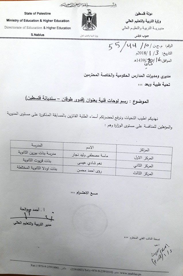 مديرية التربية والتعليم في نابلس تعلن أسماء الطلبة الفائزين في مسابقة رسم لوحات فنية بعنوان (فدوى طوقان - سنديانة فلسطين) والمؤهلين للمنافسة على مستوى الوزارة.