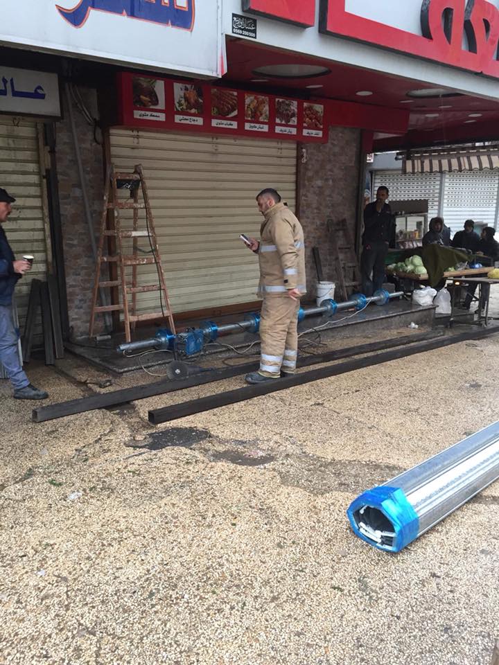 رغم المنخفض الجوي، طواقم إطفائية بلدية نابلس تتوجه لإزالة تعديات أحد المحلات وسط نابلس.
