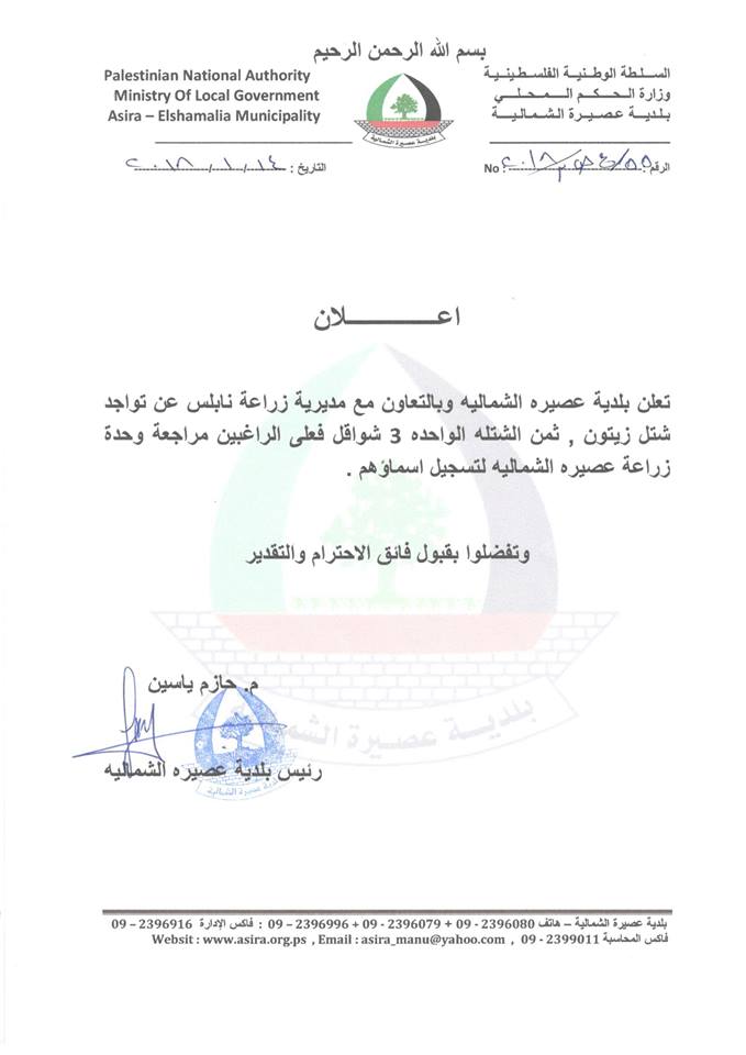 بالتعاون مع مديرية زراعة نابلس، بلدية عصيرة الشمالية تعلن عن توفر أشتال الزيتون.
