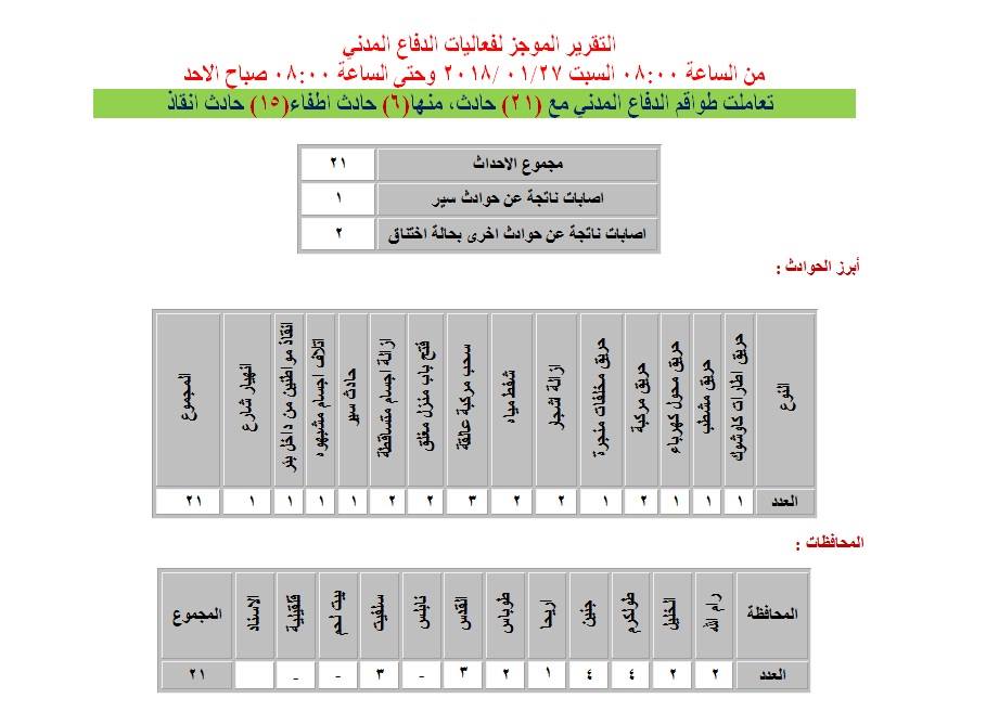 ملخص نشاط طواقم الدفاع المدني الفلسطيني ابتداءً من يوم السبت 27.01.2018، حتى صباح يوم الأحد 28.01.2018.