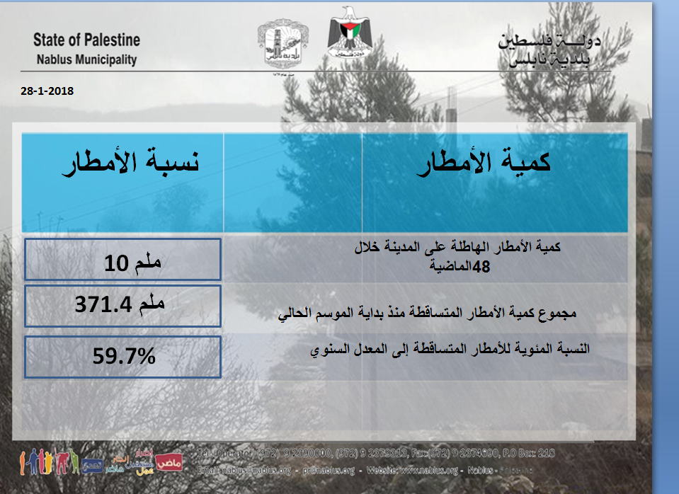 قسم المياه والصحة في بلدية نابلس ينشر تقريره عن نسبة الأمطار الهاطلة على المدينة حتى صباح يوم الأحد 28.01.2018.