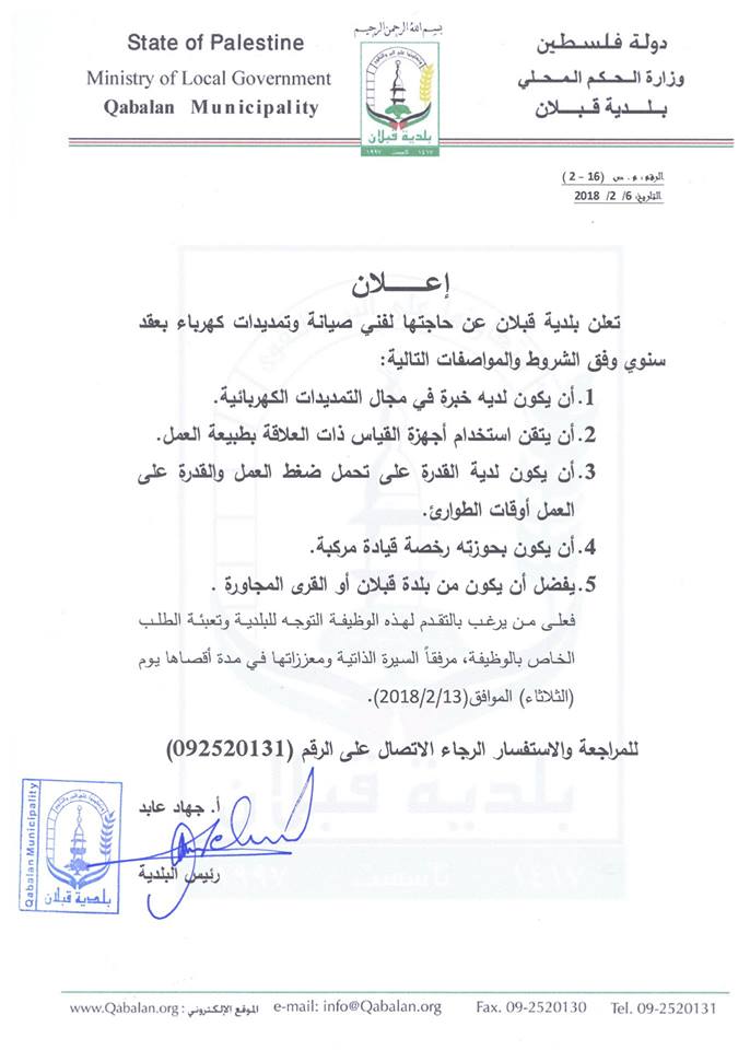 وظيفة شاغرة في بلدية قبلان - نابلس