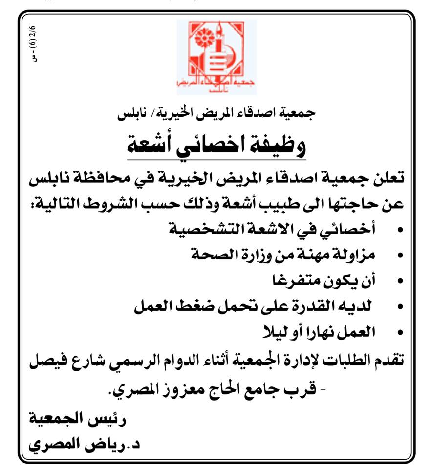 جمعية أصدقاء المريض الخيرية في نابلس تعلن عن وظيفة شاغرة في مجال الأشعة.