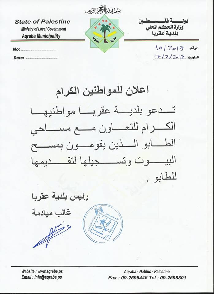 بهدف تسهيل عملية تسوية الأراضي، بلدية عقربا تدعو مواطنيها للتعاون مع العاملين في مجال الطابو.