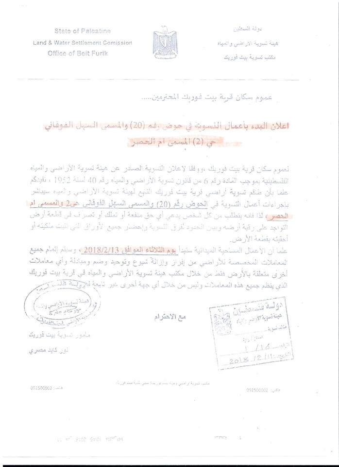 وفقاً لإعلان التسوية الصادر عن هيئة تسوية الأراضي والمياه، بلدية بيت فوريك تعلن عن البدء بأعمال التسوية في حوضي "السهل الفوقاني" و"أم الحصر"، ابتداءً من يوم الثلاثاء 13.02.2018.