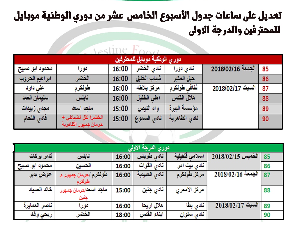 أجرت لجنة المسابقات العامة في الاتحاد الفلسطيني لكرة القدم يوم الأحد 11.02.2018، تعديلاً على ساعات جدول مباريات الأسبوع الخامس عشر من دوري الوطنية موبايل للمحترفين ودوري الدرجة الأولى "الاحتراف الجزئي".