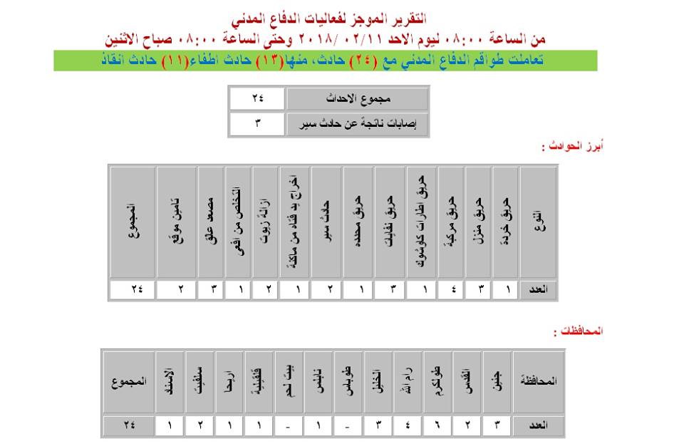 ملخص نشاط طواقم الدفاع المدني الفلسطيني ابتداءً من يوم الأحد 11.02.2018، حتى صباح الاثنين 12.02.2018.