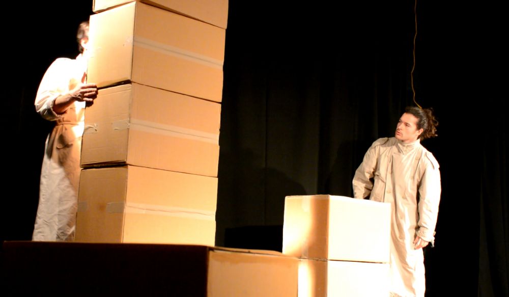 "في الصندوق" عرض بهلواني لفريف فرني، يستعرضن خفتهم باللعب مع مجموعة من الصناديق على مسرح يافا الثقافي في نابلس.