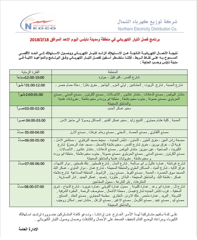 كهرباء الشمال تعلن عن مواعيد فصل الكهرباء بين الساعة العاشرة صباحاً والثامنة مساء في مدينة نابلس ليوم الأحد 18.02.2018.