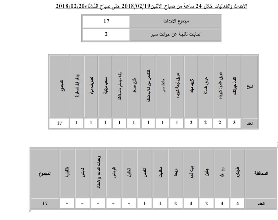 ملخص نشاط طواقم الدفاع المدني الفلسطيني ابتداءً من يوم الاثنين 19.02.2018، حتى صباح يوم الثلاثاء 20.02.2018.