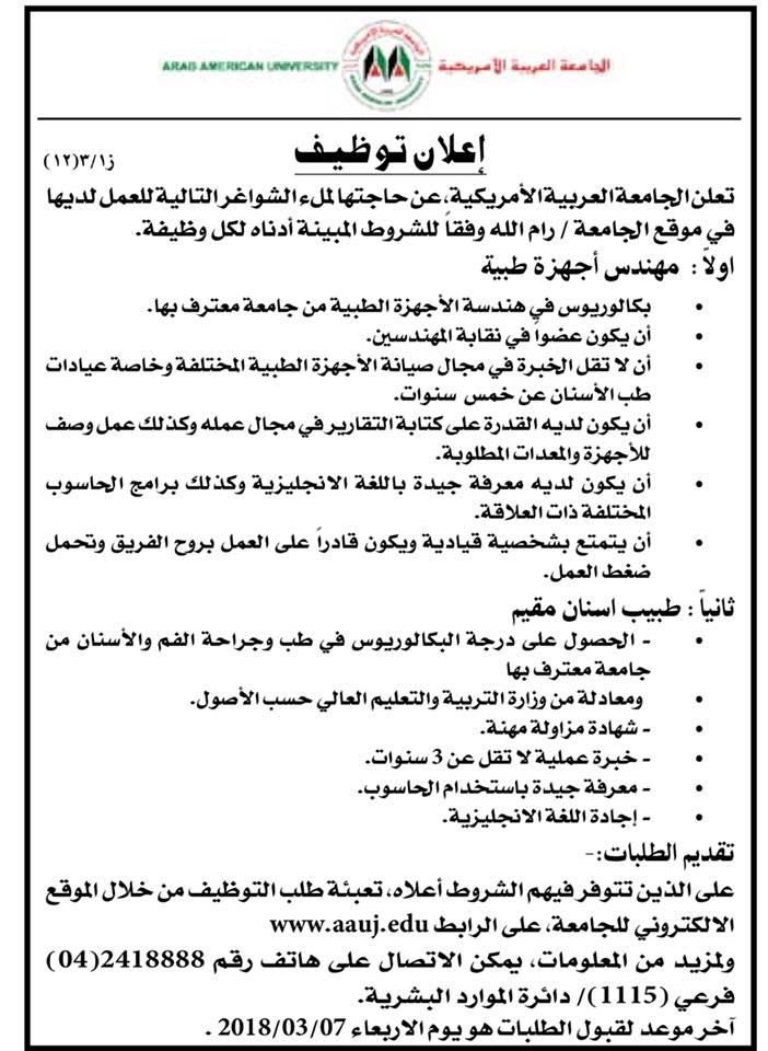 وظائف شاغرة في الجامعة العربية الأمريكية