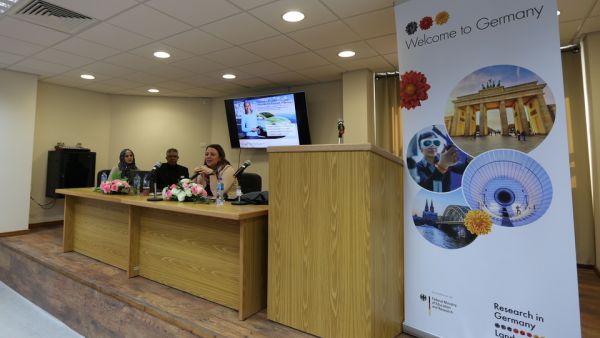ومن ثم قدمت كريستينا عرضاً يتعلق بالأكاديمين والباحثين وأطلعتهم على البرامج المختلفة من زيارات بحثية ومشاريع لاصطحاب الطلبة لألمانيا.