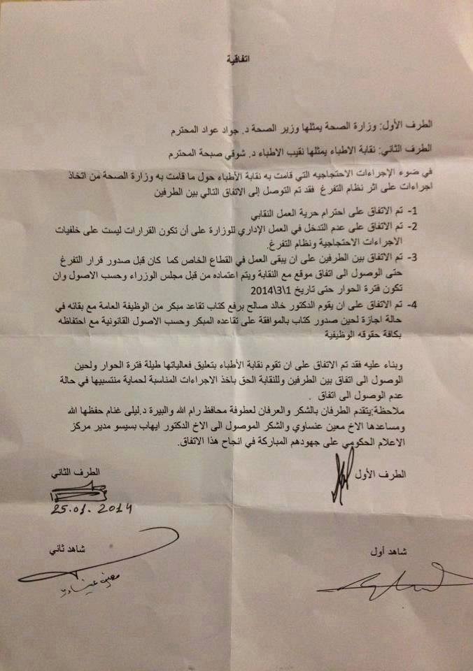 المزيد ..الاتفاق بين نقابة الأطباء والحكومة ينص على احترام حرية العمل النقابي، والاتفاق على عدم التدخل في الشؤون الإدارية للوزارة.
